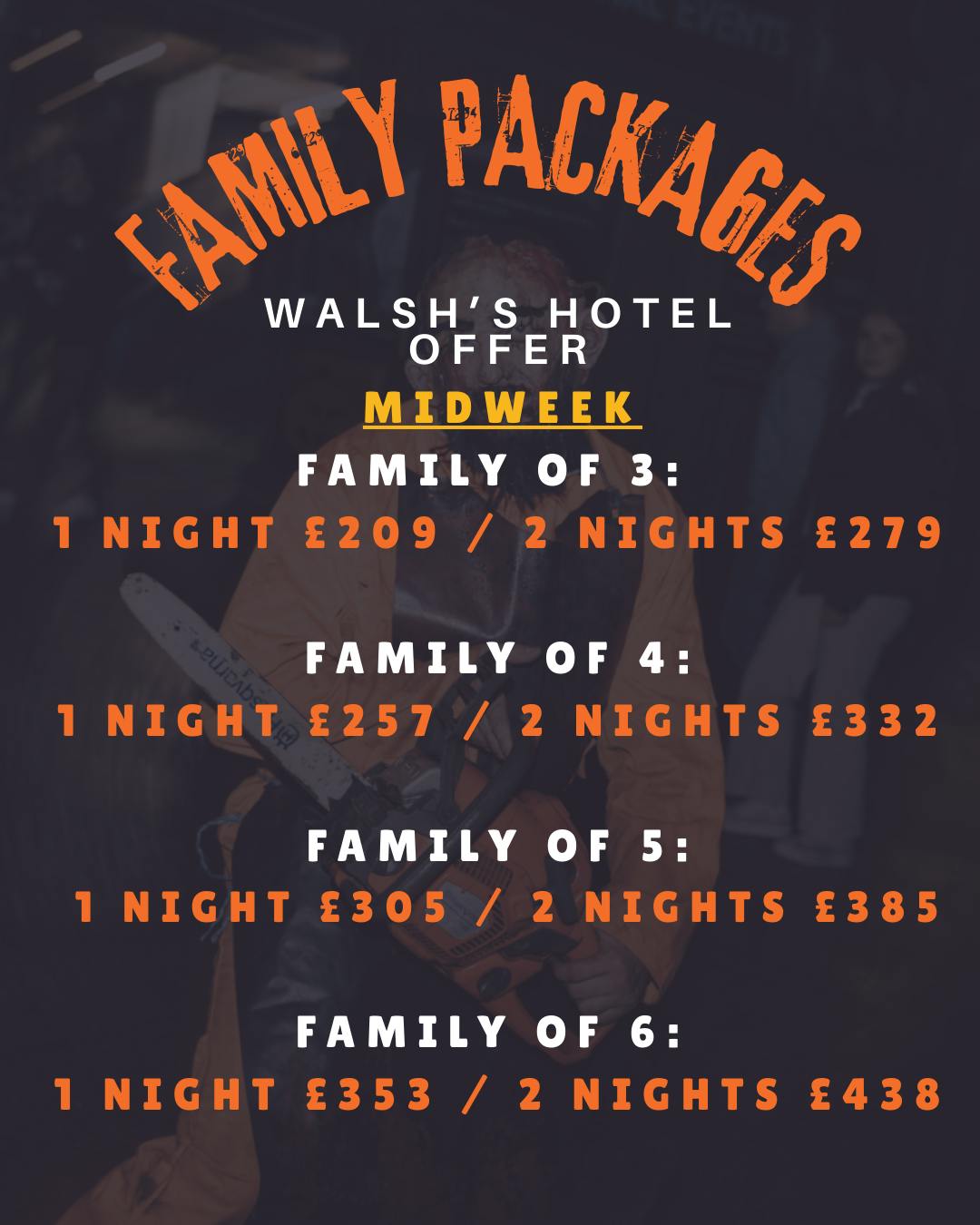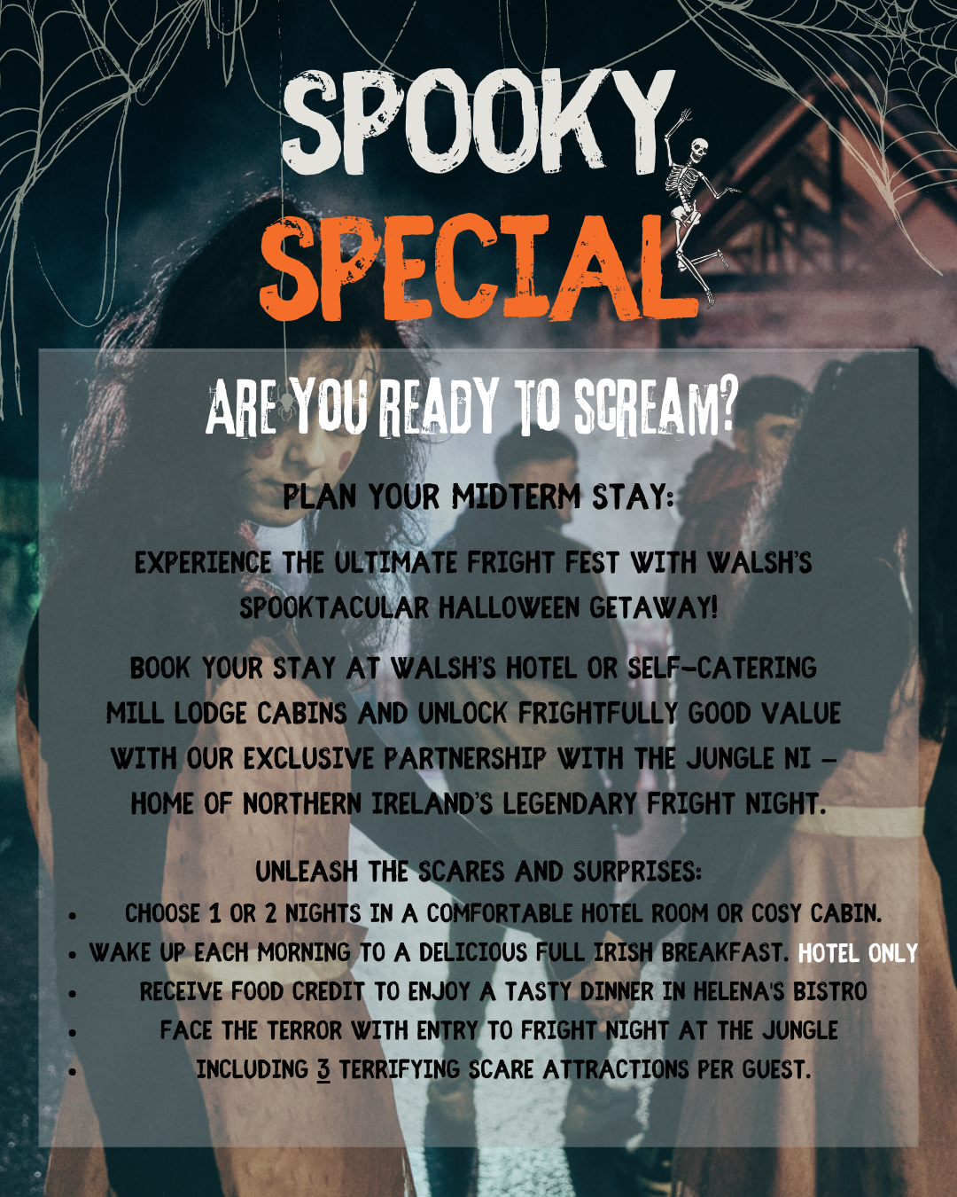 Book your stay at Walsh’s Hotel or Self-catering Mill Lodge Cabins and unlock frightfully good value with our exclusive partnership with The Jungle NI—home of Northern Ireland’s legendary Fright Night.