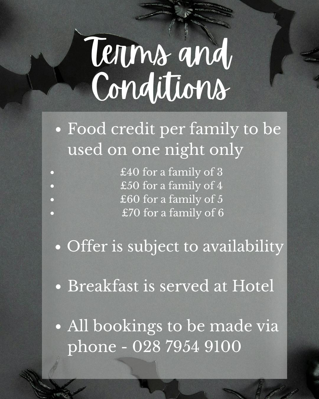 T&Cs apply. Food credit allocated per family, valid on one evening meal only. Booking is Subject to availability.