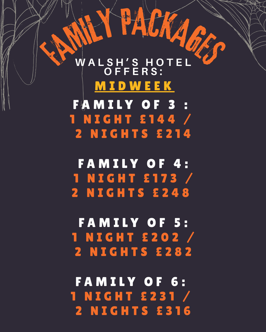 - Walsh’s Hotel: From £144 (midweek) / £164 (weekend) for a family of 3