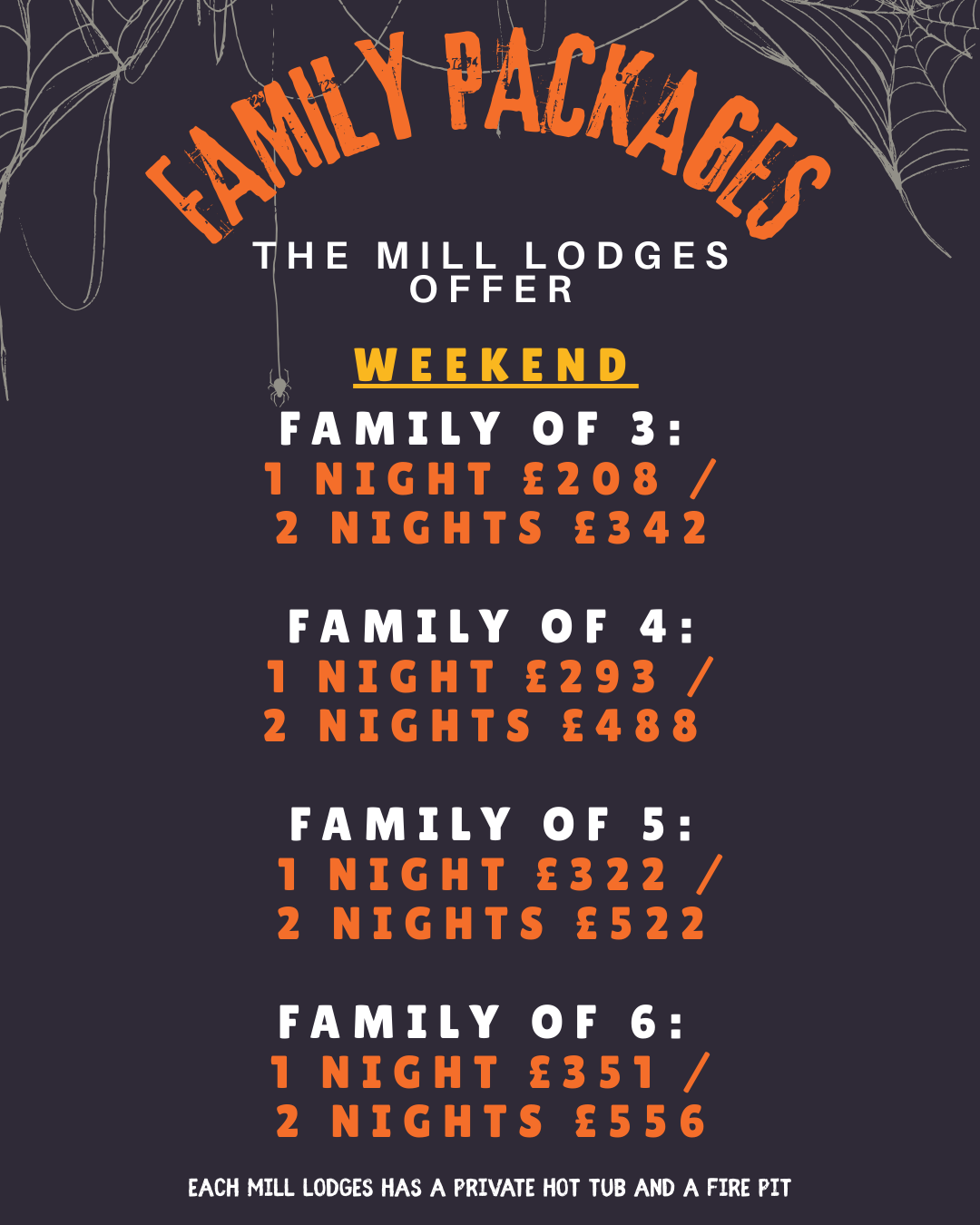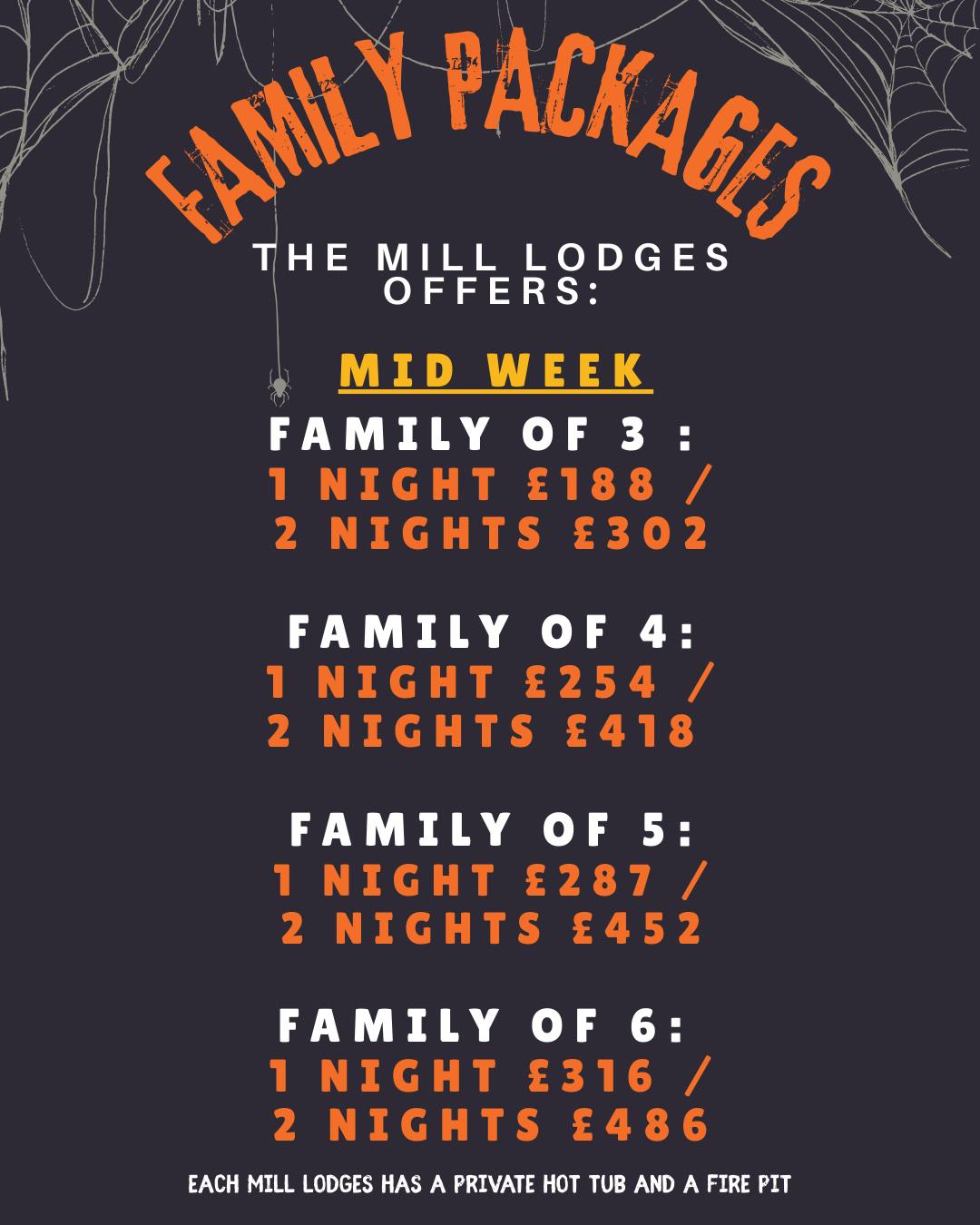 - Mill Lodge Cabins: From £188 (midweek) / £208 (weekend) for a family of 3