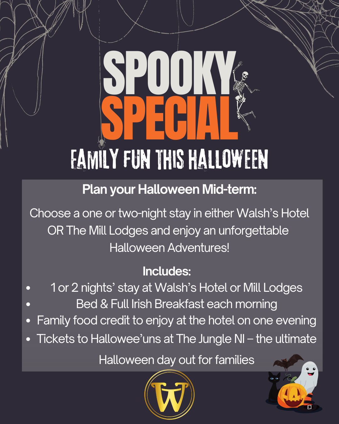 This October, give your little monsters a Halloween to remember! After the huge success of our summer family getaway, we’re back with a spooktacular Autumn Midterm Break at Walsh’s Hotel or our cosy Mill Lodge Cabins – complete with tickets to the magical Hallowee’uns experience at The Jungle NI.